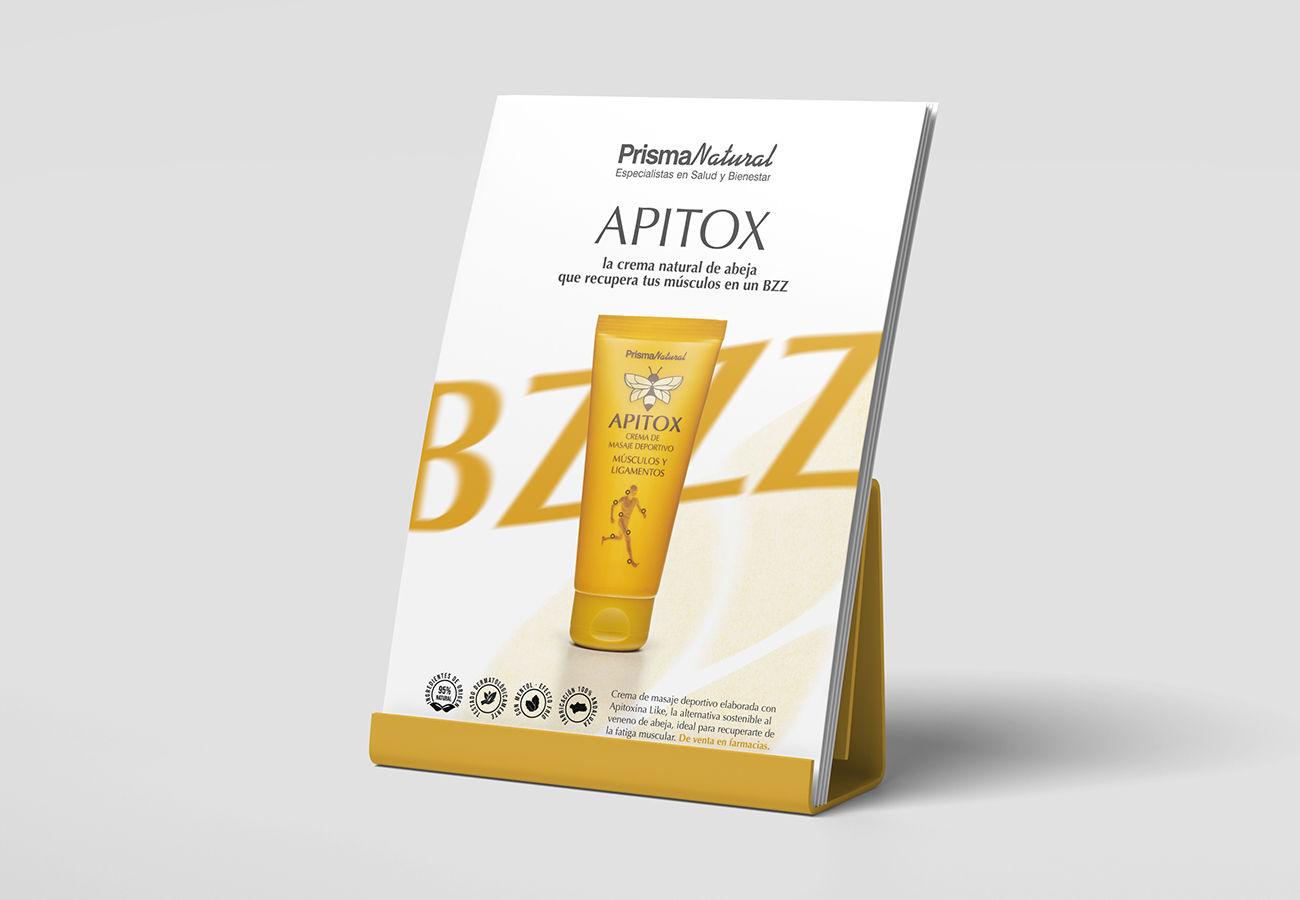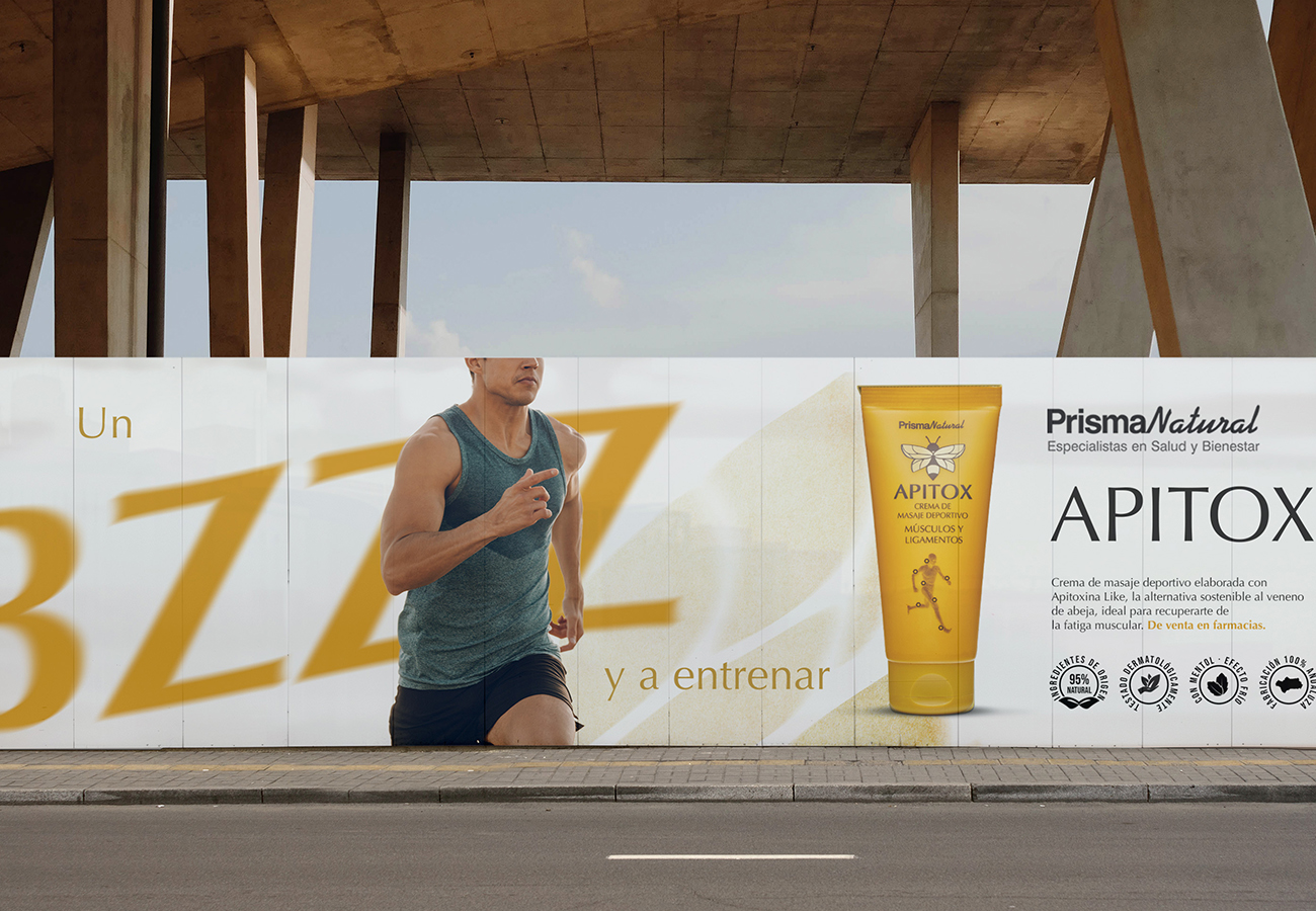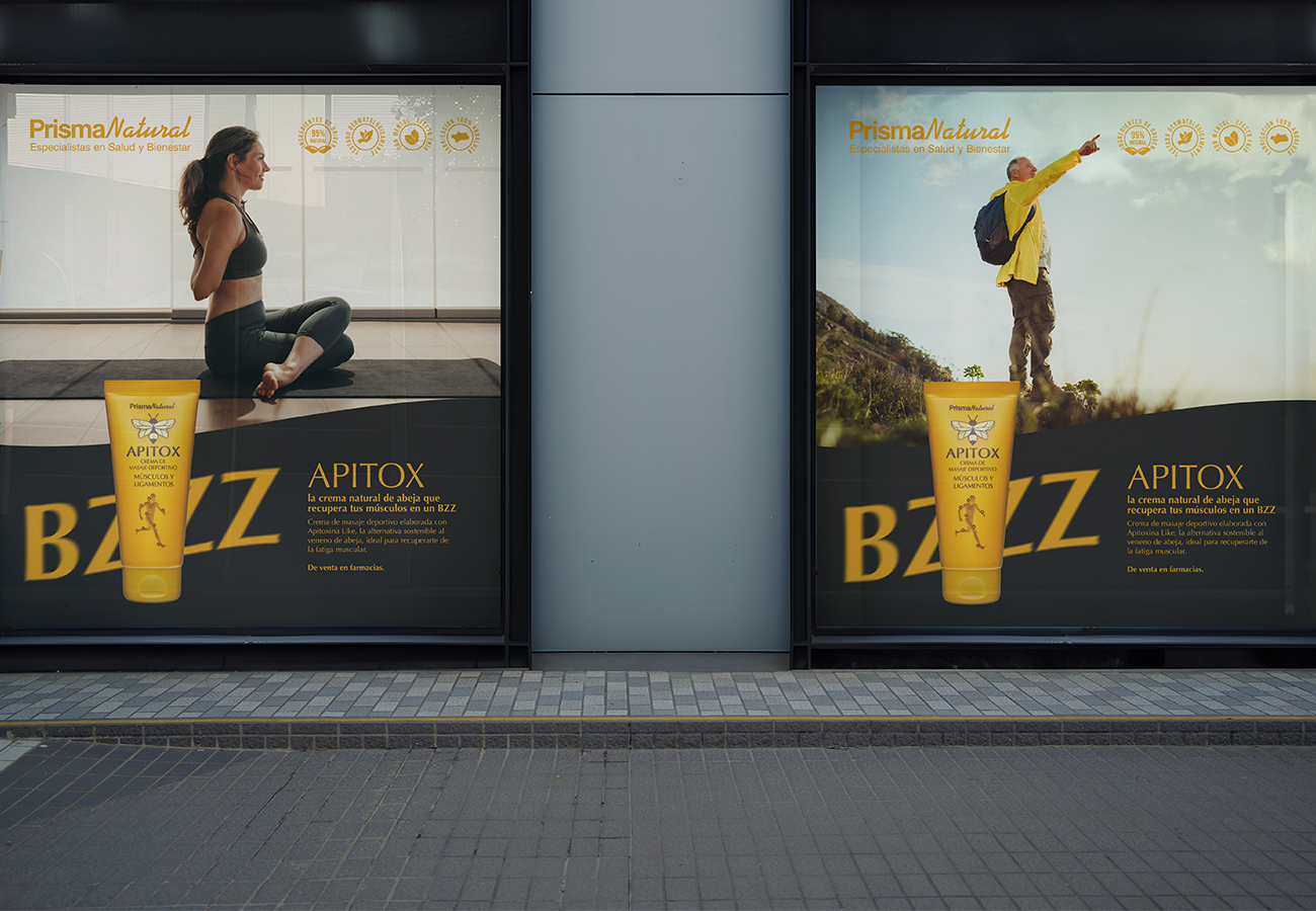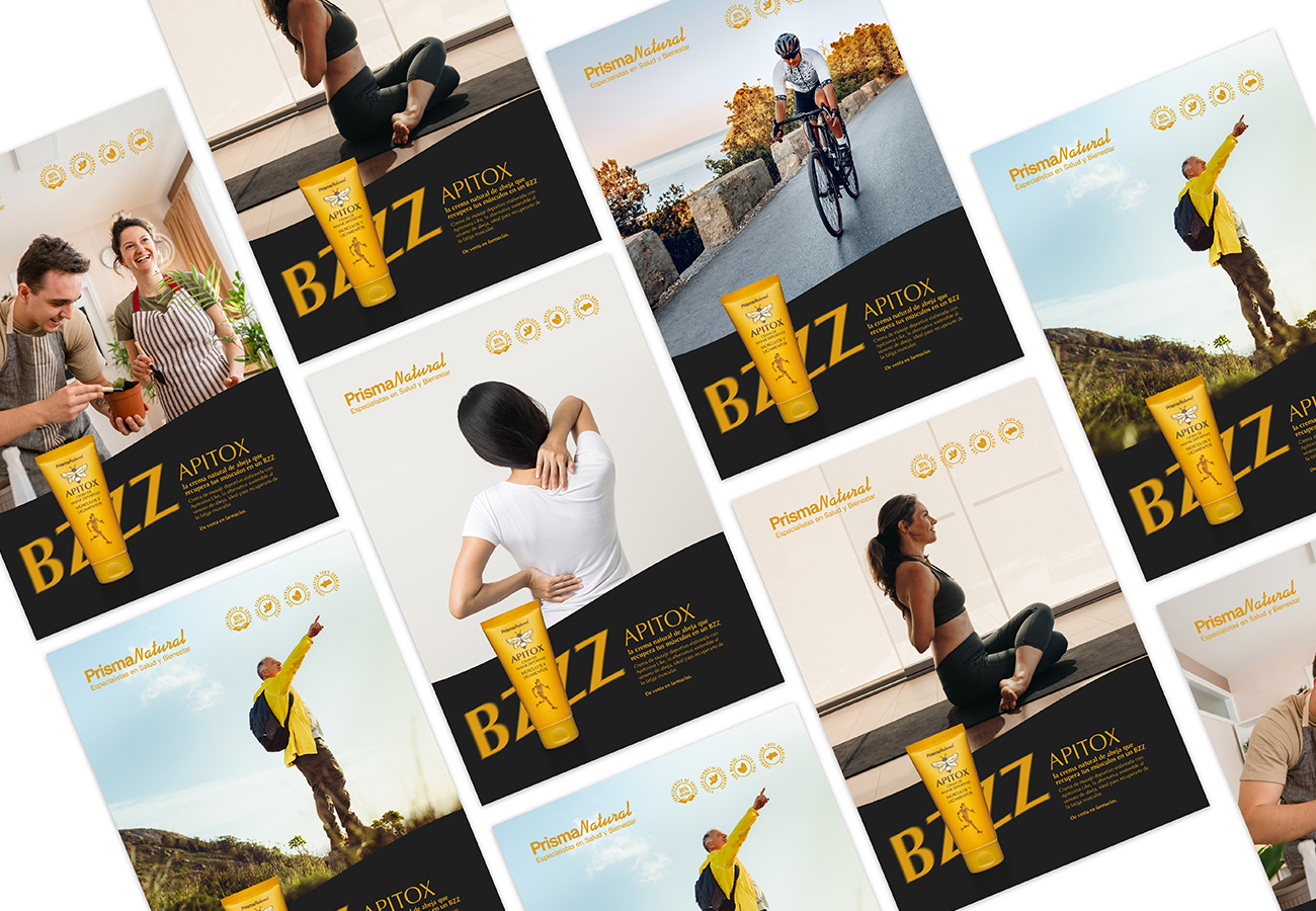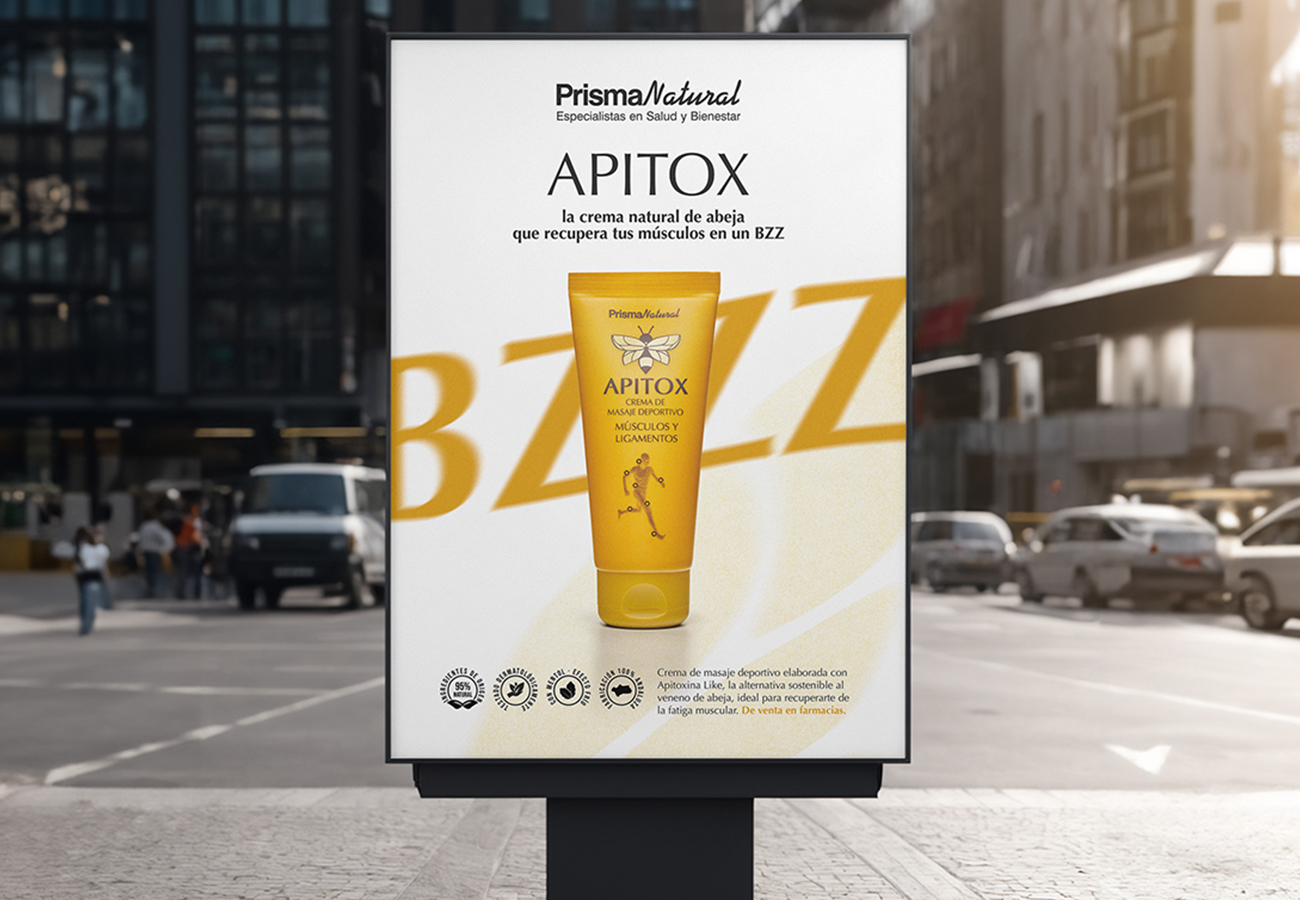 Laboratorios Prisma Natural lanza al mercado APITOX: una crema natural, elaborada a base de veneno de abeja, ideal para aliviar las molestias del día a día. Y para comunicarlo de una forma notoria y diferente solo hacen falta cuatro letras: BZZZ. El sonido de las abejas, pero también el de la rapidez con la que actúa la crema Un concepto sencillo y muy sonoro, sobre el que hemos creado una serie de piezas en las que la onomatopeya tiene un papel protagonista. Una campaña memorable y que ha hecho tanto ruido como un enjambre.